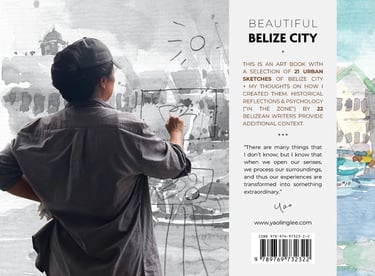 This is an art book with a selection of 21 urban sketches of Belize City + my thoughts on how I created them. Historical reflections and psychology (“In the Zone”) by 22 Belizean writers provide additional context.